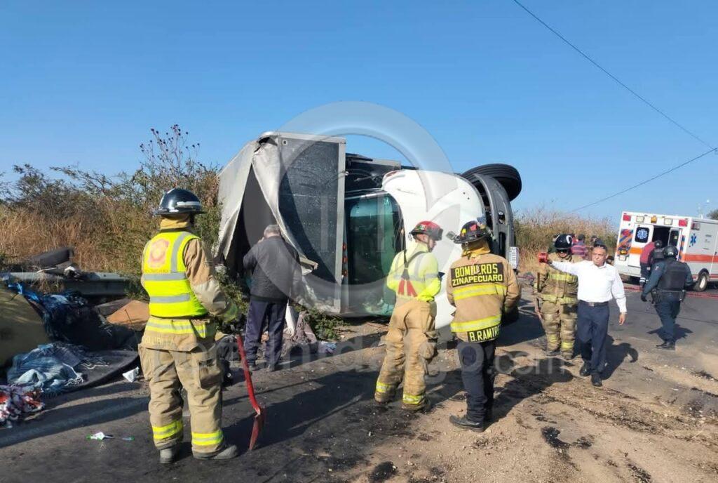 Al tener conocimiento del percance, al sitio se trasladaron oficiales de la Guardia Civil y Bomberos Voluntarios de Zinapécuaro, mismos que entre los escombros de la unidad de carga encontraron el cuerpo sin vida de Jared C., de 16 años de edad, vecino de Huanímaro, Guanajuato. Otras 5 personas que viajaban en el vehículo resultaron ilesas.