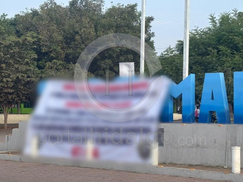 Buenavista, Mich.-La mañana de este martes, habitantes de la localidad 18 de Marzo se sorprendieron al descubrir una narcomanta colocada en las letras monumentales situadas en la plaza principal, a un costado de la carretera Apatzingán-Tepalcatepec.