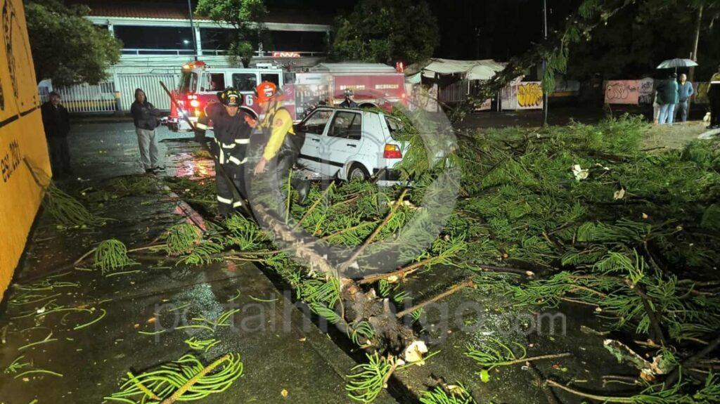 Los vulcanos se encargaron de segmentar el árbol caído para retirarlo. En las labores de ayuda también participaron los patrulleros municipales. Al final una grúa remolcó el coche siniestrado, el cual es de la marca Volkswagen, color azul celeste.