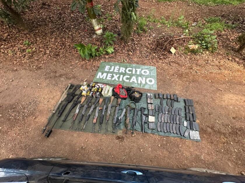 En el sitio fueron aseguradas 14 armas de fuego largas, entre ellas dos fusiles calibre .50 milímetros, considerados de uso exclusivo de las Fuerzas Armadas, así como 148 cargadores, cartuchos de diversos calibres y tres vehículos presuntamente vinculados a actividades ilícitas.
