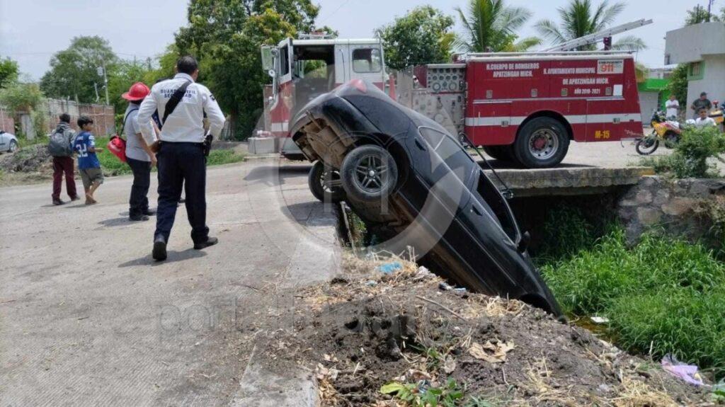 Apatzingán, Mich.-Un vehículo particular terminó parcialmente dentro de un canal de aguas negras en la colonia Antorcha Campesina, en esta ciudad, sin que se reportaran personas lesionadas.