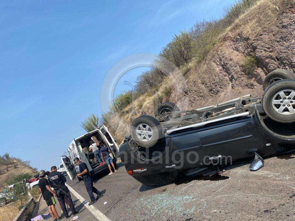 Finalmente, en kilómetro 203+000 del tramo Nueva Italia – Las Cañas, dentro del municipio de Arteaga, una camioneta Mitsubishi Montero volcó, resultando lesionados sus 5 ocupantes, uno de ellos de consideración, por lo que paramédicos acudieron a su auxilio.