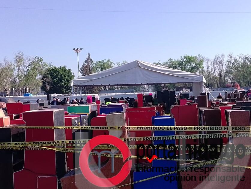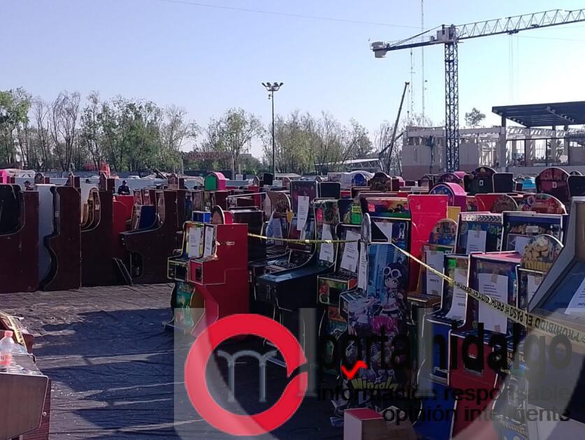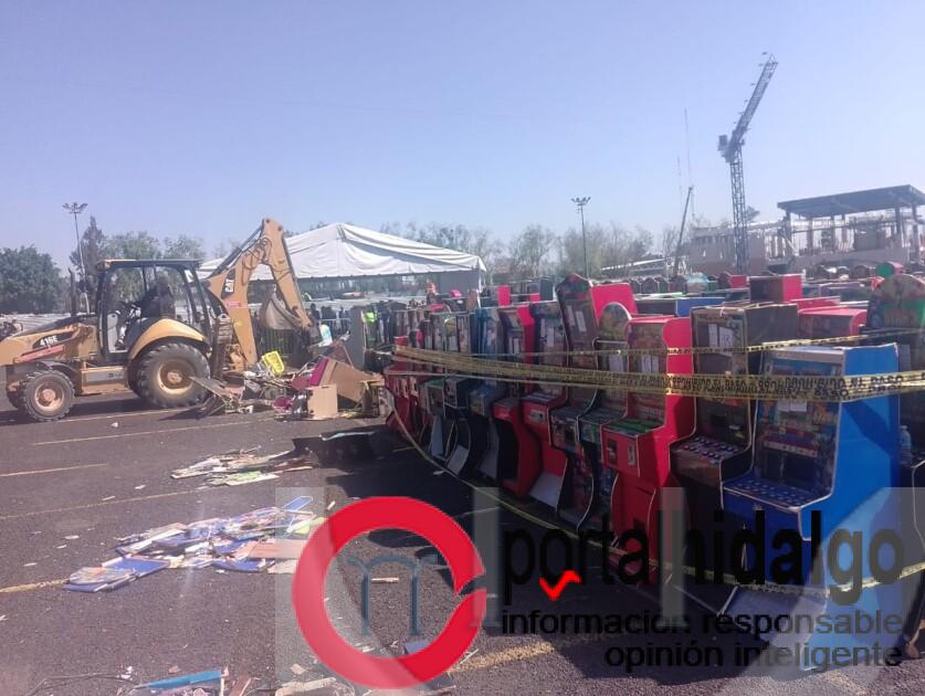 En el Estadio Morelos, las máquinas tragamonedas fueron trituradas con maquinaria especializada, tras los operativos y decomisos por parte de las diversas corporaciones policiales.