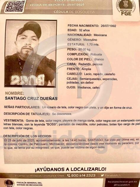 Del caso de Santiago se supo que él fue visto por última vez alrededor de las 14:40 horas del pasado viernes 25 de julio en la colonia Centro de esta cabecera municipal, desde entonces se desconoce su paradero y sus familiares temen por su integridad física.