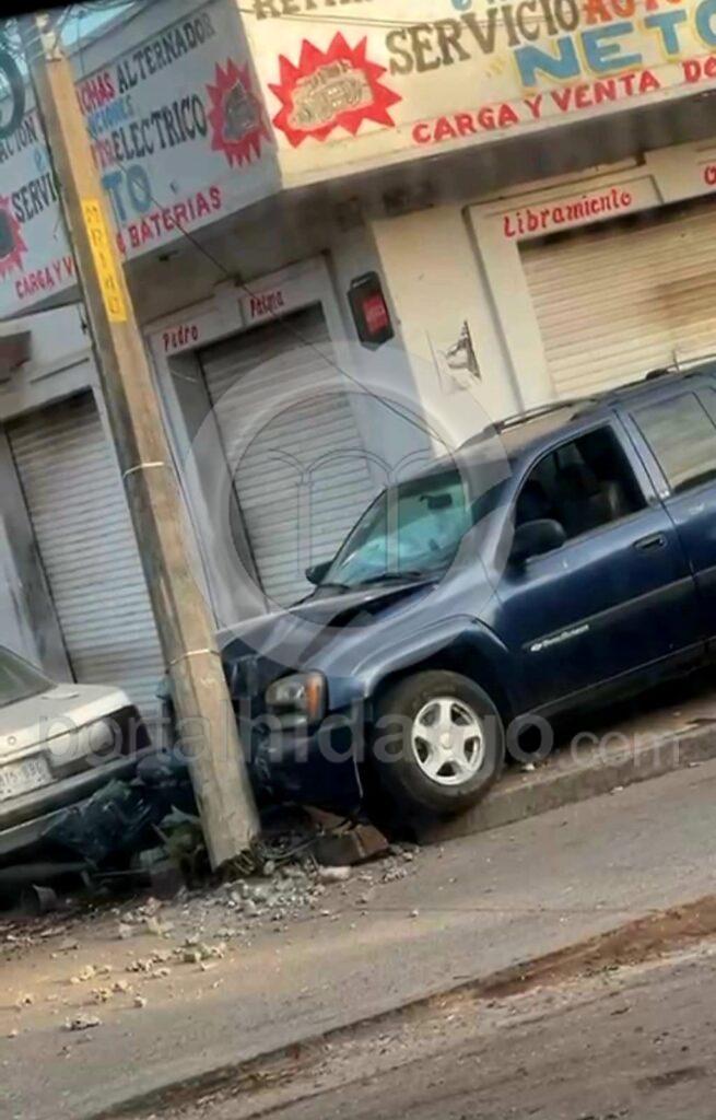 La colisión ocurrió sobre la lateral del Libramiento Oriente, esquina con la calle Pedro Palma, donde participaron un vehículo Volkswagen Tiguan y una camioneta Chevrolet Trail Blazer, de color azul, ésta última unidad salió proyectada contra un poste y estuvo a punto de derribarlo.