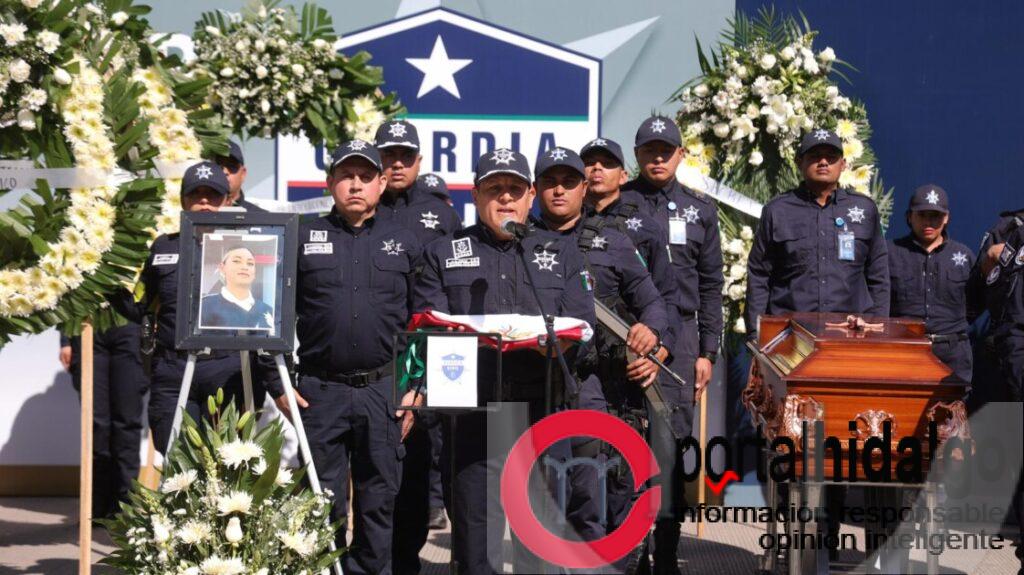 Elementos formados en posición de honor, mandos policiales y familiares atestiguaron el último pase de lista. Su nombre fue pronunciado con firmeza y respondió el eco institucional de un “¡Presente!”.