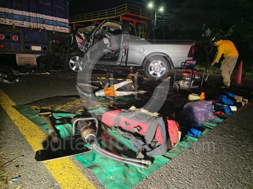 Se apreció que el referido vehículo es de la marca Ram, pick up, color gris, el cual terminó destrozado de la parte delantera y el piloto quedó atrapado entre el metal retorcido.