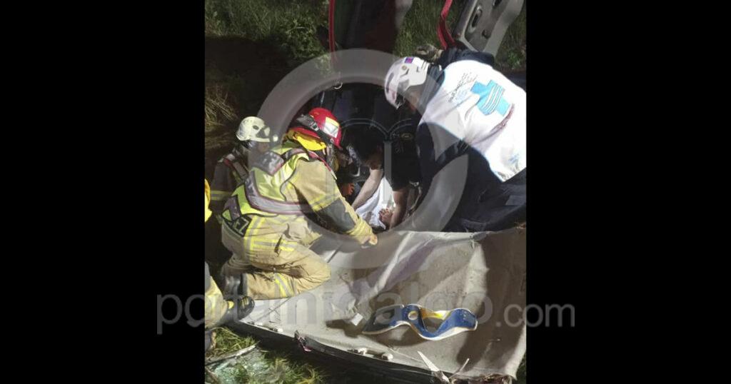 El vehículo siniestrado quedó volcado fuera de la cinta asfáltica. Las labores de rescate se extendieron durante varias horas, apoyadas por equipos especializados como herramientas hidráulicas de corte y expansión.