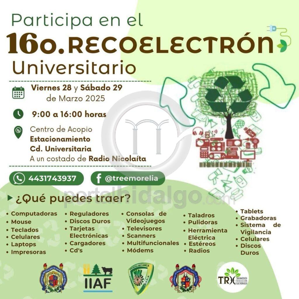 La Universidad Michoacana de San Nicolás de Hidalgo (UMSNH) invita a la población en general a participar en el 16° Recoelectrón Universitario, que se llevará a cabo el próximo 28 y 29 de marzo.