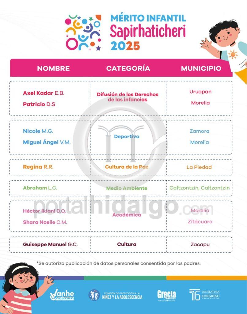 Los condecorados son: en la categoría Difusión de los Derechos de las Infancias, Axel K. (Uruapan) y Patricio D. (Morelia); categoría deportiva, Nicole M. (Zamora) y Miguel Ángel V. (Morelia); por Cultura de la Paz, Regina R. (La Piedad); categoría de Medio Ambiente, Abraham L. (Caltzontzin); por el rubro de Académica, Héctor I. (Morelia) y Shara N. (Zitácuaro); y, por la categoría Cultural, Guiseppe M. (Zacapu).