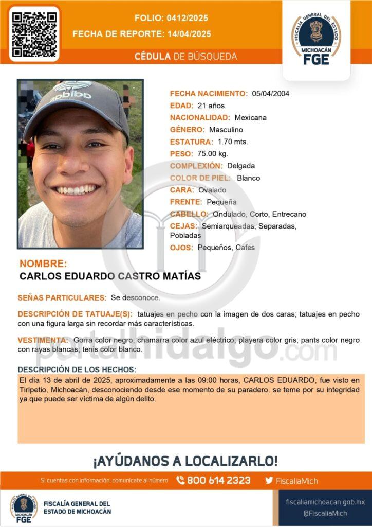 Se supo que el citado joven es alumno de la Escuela Normal Rural “Vasco de Quiroga”. De acuerdo con la ficha de búsqueda, Carlos Eduardo fue visto por última vez alrededor de las 09:00 horas del pasado domingo 13 de abril, en la Tenencia de Tiripetío.