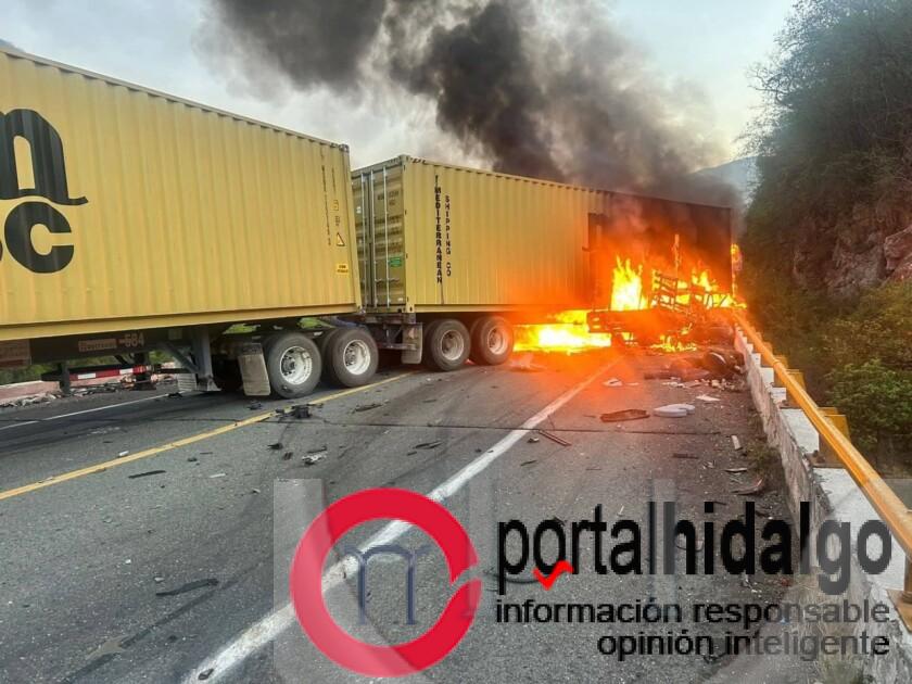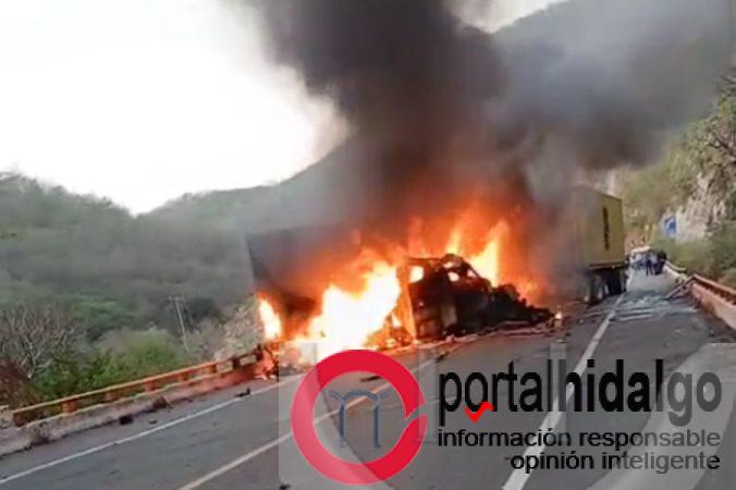 La Unión, Gro.-La mañana de este lunes se registró un fatídico choque entre una camioneta y un camión de carga, sobre la autopista Siglo XXI, dejó como saldo preliminar dos personas sin vida y un lesionado grave. Las unidades involucradas se incendiaron ocasionando cierre total a la circulación.