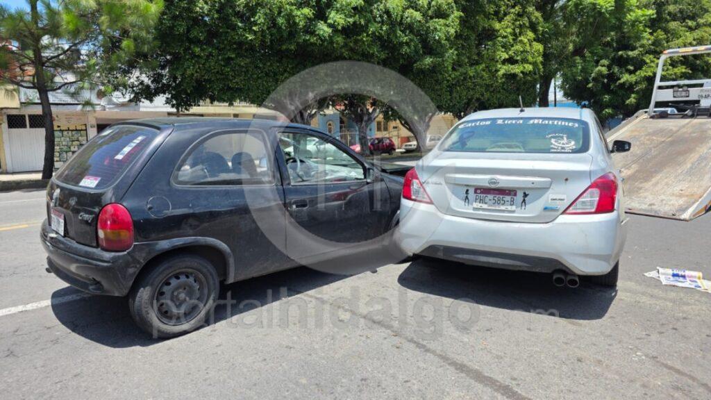 El aparatoso accidente tuvo lugar sobre la Avenida Juárez a la altura de la antigua gasolinera, donde colisionaron un auto Nissan Versa, de color gris, con placas PHC-585-B y un vehículo Chevrolet Chevy de color negro, con matrícula PHL-798-E.