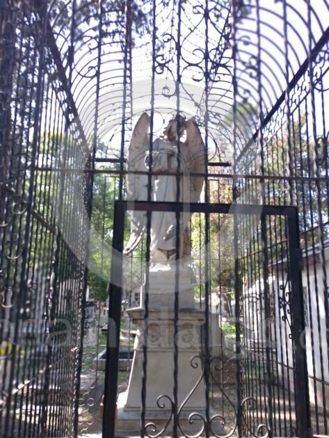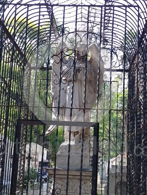 Su figura es de casi dos metros, y aunque luce el deterioro del paso de los años el ángel enjaulado lucha incesante por salir de su jaula que lo mantiene enclaustrado sobre una tumba en el panteón municipal de Morelia.