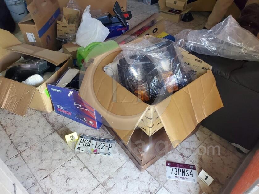 En el lugar fueron localizadas diversas autopartes nuevas, así como juegos de placas de circulación de distintas entidades, entre ellas Michoacán, Texas y Ciudad de México. Asimismo, se aseguró una placa de con reporte de robo ocurrido en 2018 y que estaba relacionada con un vehículo que ya había sido recuperado con anterioridad.