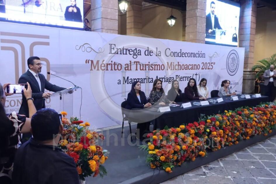 El Congreso del Estado a través de la Comisión de Turismo, entregó la Condecoración “Mérito al Turismo Michoacano 2025” a Margarita Arriaga Pierres quien, con su esfuerzo, dedicación y compromiso, contribuyó de manera significativa al desarrollo, atención y promoción de la actividad turística en el estado.