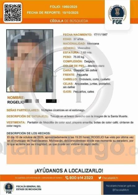 Posteriormente arribó la Unidad de Servicios Periciales y Escena del Crimen (USPEC), la cual inició las averiguaciones respectivas. Durante las primeras averiguaciones se descubrió que el finado respondía al nombre de Rogelio G., de 37 años de edad, quien fue visto por última vez con vida el pasado 10 de octubre de 2025 en Huandacareo.