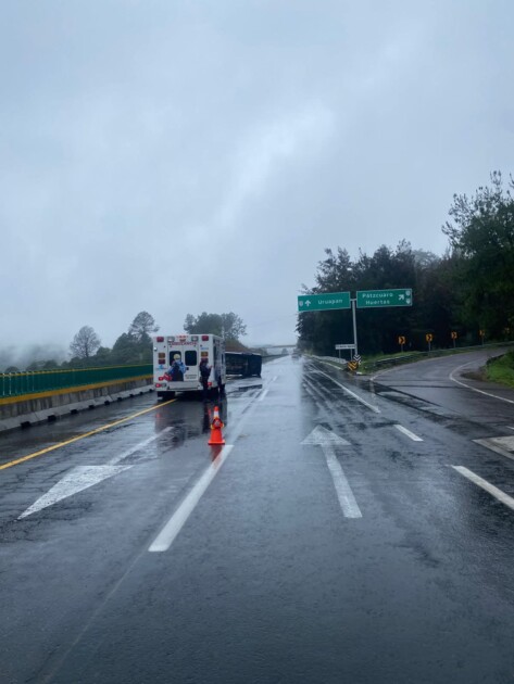 En otro punto, en el kilómetro 79+800 del tramo carretero Pátzcuaro-Uruapan, se registró la volcadura de una camioneta. Afortunadamente, no se reportaron personas heridas, aunque fue necesaria la intervención de equipos de auxilio para retirar la unidad.