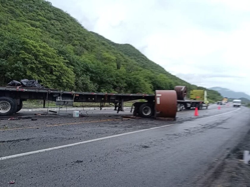 Uno de los percances más aparatosos ocurrió a la altura del kilómetro 238, en el municipio de Arteaga, donde un vehículo de carga que transportaba rollos metálicos sufrió un accidente. El material quedó esparcido sobre la cinta asfáltica, generando un bloqueo parcial y complicaciones al tránsito en esa zona.