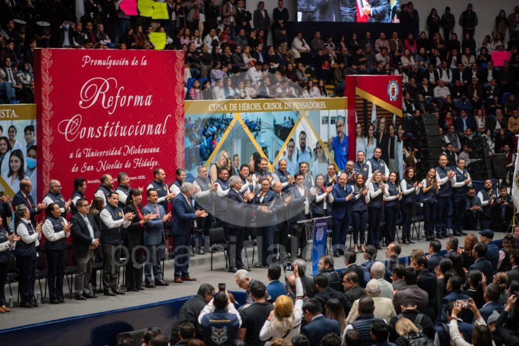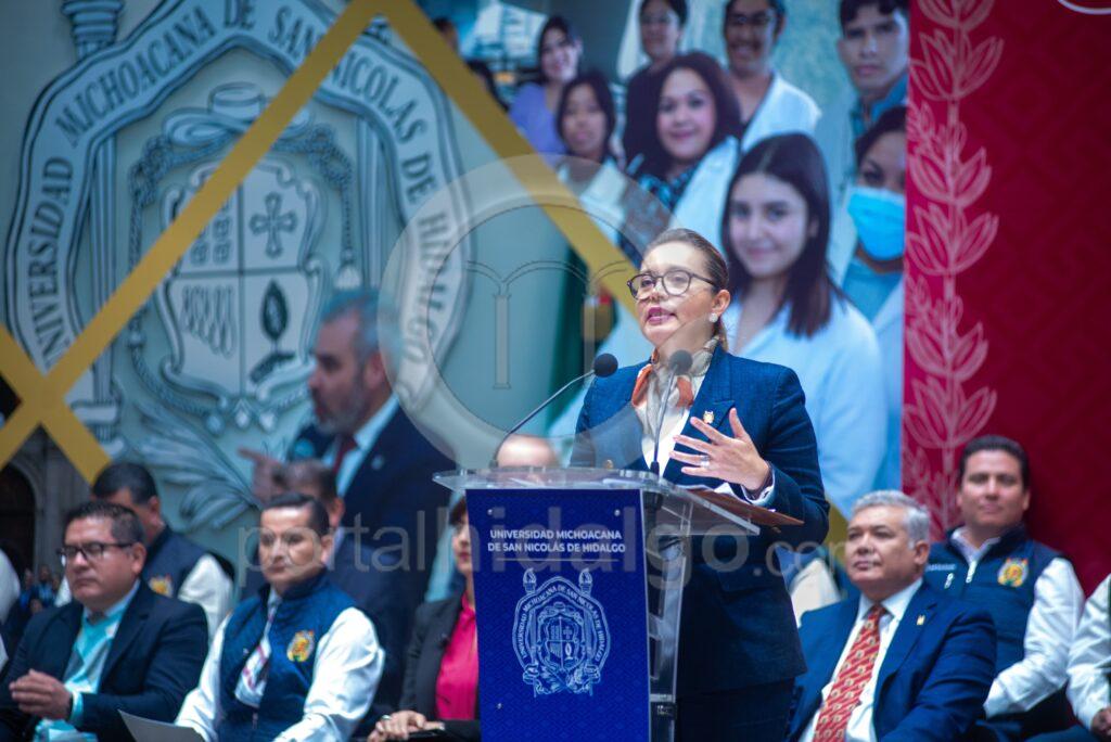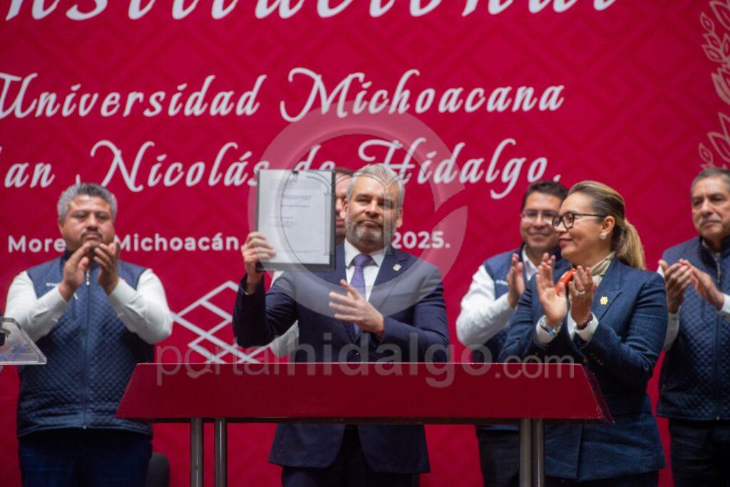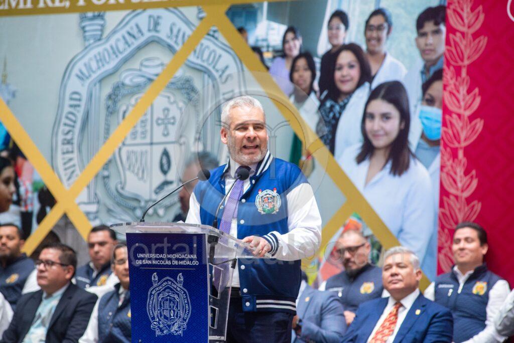 Flanqueado por la rectora Yarabí Ávila, representantes del Poder Legislativo y Judicial, de directoras y directores de facultades y con la presencia de consejeras y consejeros universitarios, diputadas, diputados, alcaldesas, munícipes, así como funcionariado estatal y nicolaita, el mandatario estatal apuntó que este hecho es histórico.