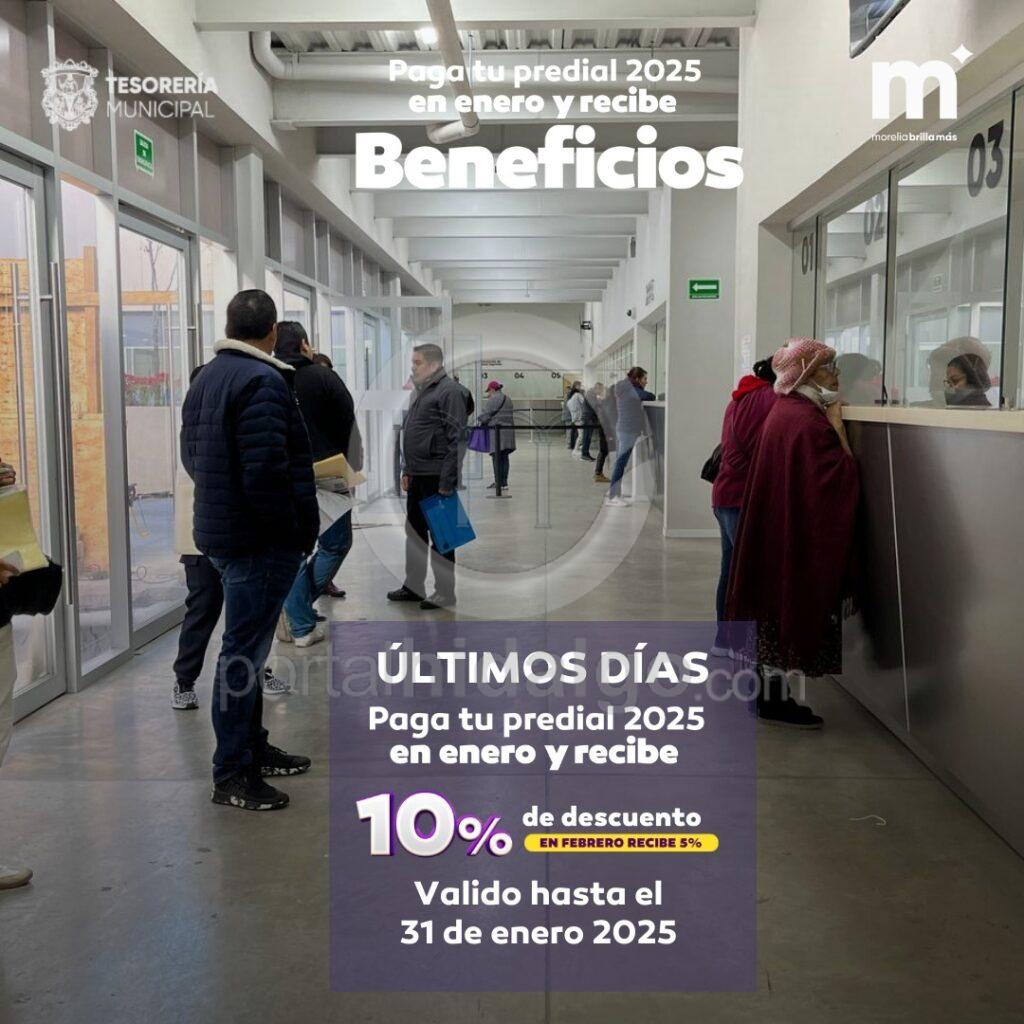 El Gobierno de Morelia invita a la ciudadanía a aprovechar los últimos días de enero para obtener el 10 por ciento de descuento en el pago de la contribución municipal del Predial 2025.