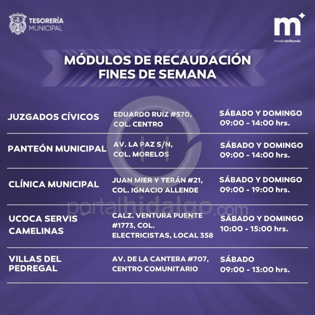 Además del Centro Administrativo de Morelia (CAM), los contribuyentes pueden acudir a los 17 módulos de recaudación distribuidos en puntos estratégicos dentro de la mancha urbana, y en las tenencias de Capula, Tiripetío y Teremendo de los Reyes.