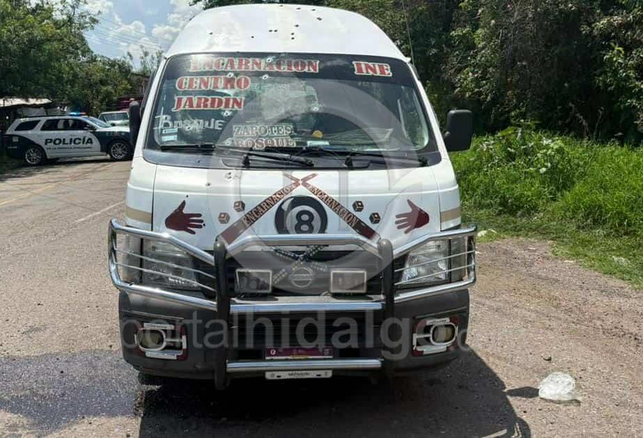 La otra unidad también es una combi de la Ruta La Encarnación, con número económico 8 y matrícula A46270N, la cual estaba rafagueada, la mayoría de los impactos se le apreciaron en la parte frontal.