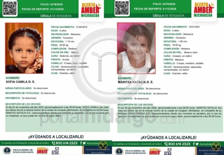Uruapan, Mich.-Maritza Natalia y Sofía Camila, de 4 y 6 años de edad, hijas de la joven Maritza E., localizada asesinada en un tambo en el río Santa Bárbara, al oriente de Uruapan, permanecen en calidad de desaparecidas y cuentan con fichas de búsqueda de Alerta Amber.