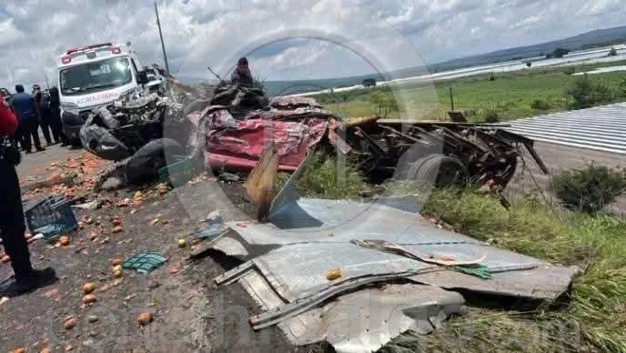 Yurécuaro, Mich.-La tarde de este miércoles se registró un brutal choque en la carretera La Piedad-Yurécuaro, en el que un tráiler acabó volcado y aplastó a una camioneta que transportaba cajas con jitomate, falleciendo su conductor.