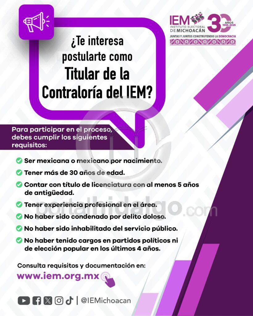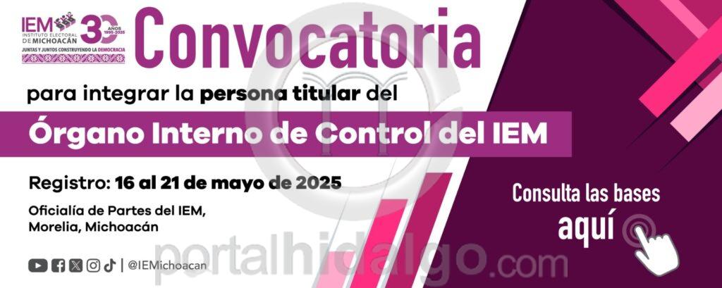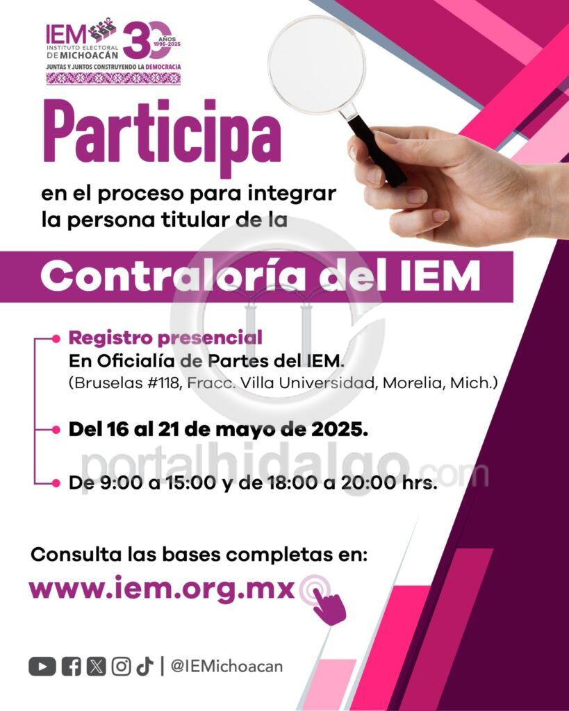 El Instituto Electoral de Michoacán (IEM) informa que a partir de hoy y hasta el próximo 21 de mayo se llevará a cabo la recepción de documentos para quienes deseen participar en el concurso público abierto para ocupar la titularidad del Órgano Interno de Control del Instituto.