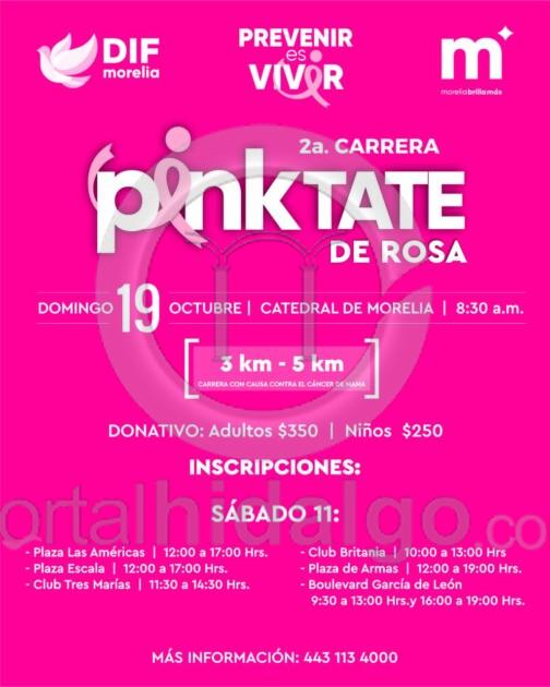 La presidenta honoraria del DIF Morelia, Paola Delgadillo Hernández, invita a la ciudadanía a inscribirse a la 2ª Carrera Atlética “Pinktate de Rosa”, que se llevará a cabo el domingo 19 de octubre, con salida en Catedral de Morelia y recorridos de 3 y 5 kilómetros.