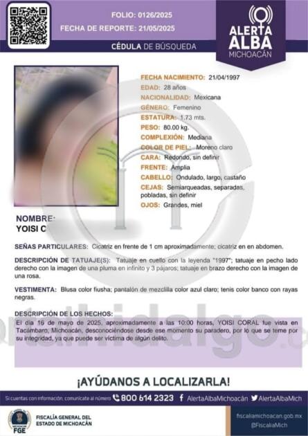 Se trata de Yoisi C., de 28 años de edad, ella fue vista por última vez con vida en la citada fecha y lugar, alrededor de las 10:00 horas, desde entonces se desconoció su pradero y sus familiares reportaron la situación el día 21 de mayo ante la Fiscalía General del Estado (FGE), la cual emitió una Alerta Alba con foto y características físicas de la susodicha.