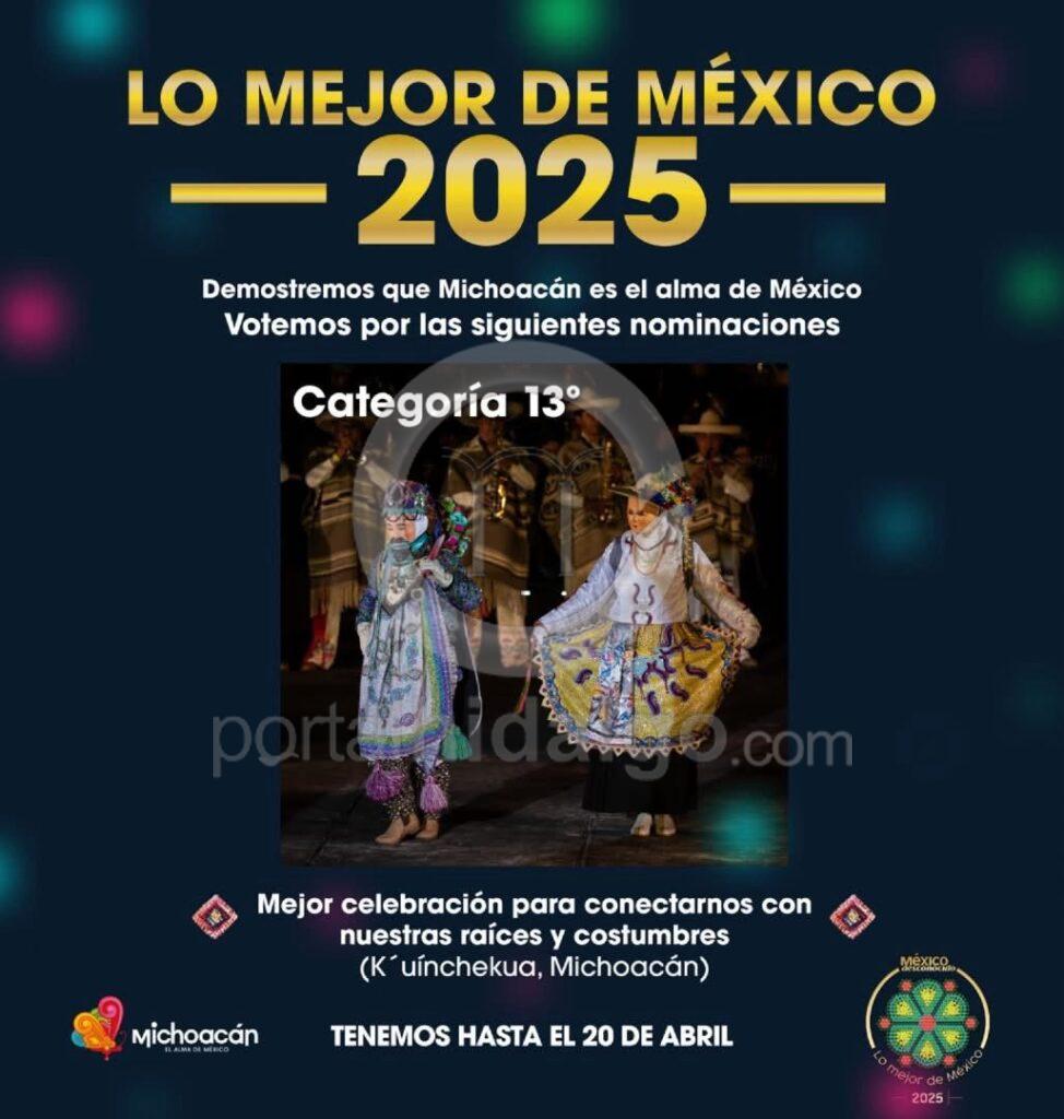 Las votaciones para seleccionar a lo Mejor de México 2025, siguen su curso, y Michoacán compite en siete categorías. La K’uínchekua está nominada a Mejor celebración para conectarnos con nuestras raíces y costumbres.