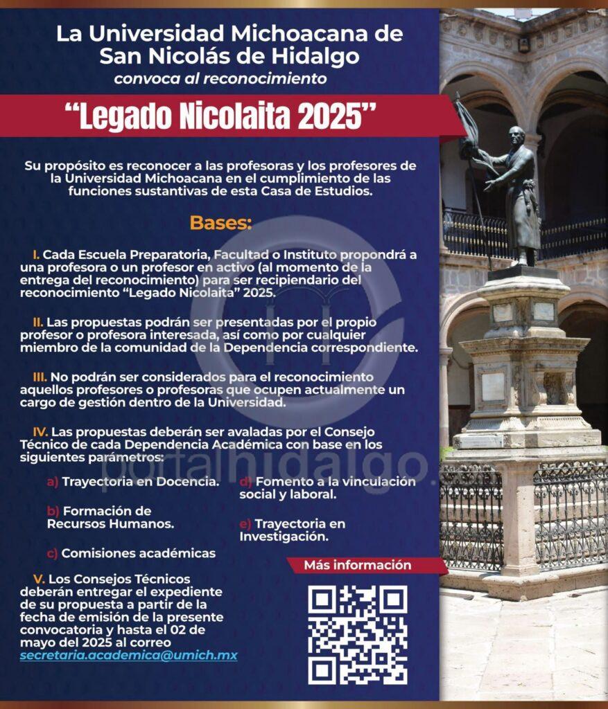Como una forma de reconocer el trabajo y la trayectoria de las y los docentes de la institución, la Universidad Michoacana de San Nicolás de Hidalgo (UMSNH) entregará por segunda ocasión en su historia el galardón “Legado Nicolaita 2025”, por lo que se invita a la comunidad a participar con propuestas.