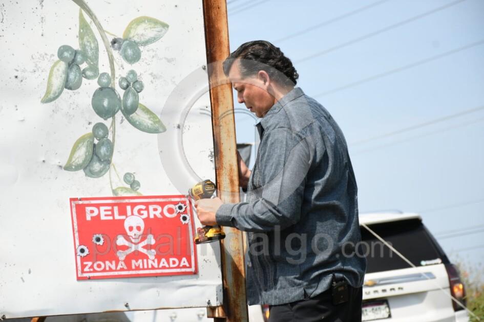 Buenavista, Mich.-“Mientras otros vienen a la sesión y se van, yo me vengo a recorrer Tierra Caliente para seguir colocando letreros y alertar a la población del riesgo que implica vivir aquí. Las minas terrestres siguen matando a la gente, a nuestros jornaleros, maestros y militares y eso se tiene que terminar”, señaló el presidente del PRI en Michoacán y diputado local, Memo Valencia.