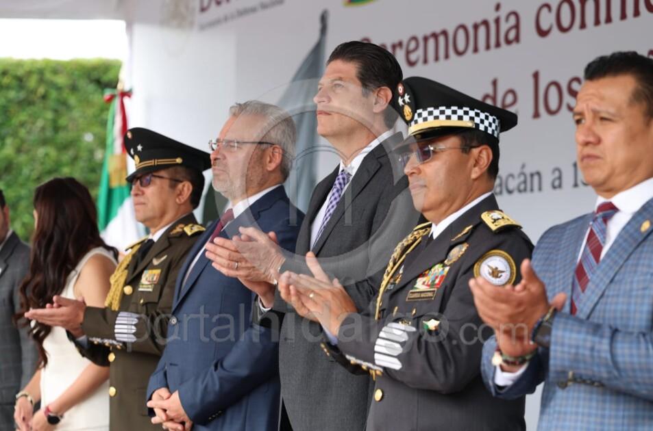 Posteriormente, los integrantes del presidium, entre ellos, el gobernador, Alfredo Ramírez Bedolla; la diputada Giulianna Bugarini Torres, presidenta de la Mesa Directiva del Congreso del Estado; el coordinador Estatal de la Guardia Nacional, General de Brigada Roberto Eduardo Molina García; el secretario de Gobierno, Raúl Zepeda Villaseñor; el fiscal General del Estado, Carlos Torres Piña; realizaron guardia de honor en el monumento a los Niños Héroes, como símbolo de respeto y gratitud hacia su legado.