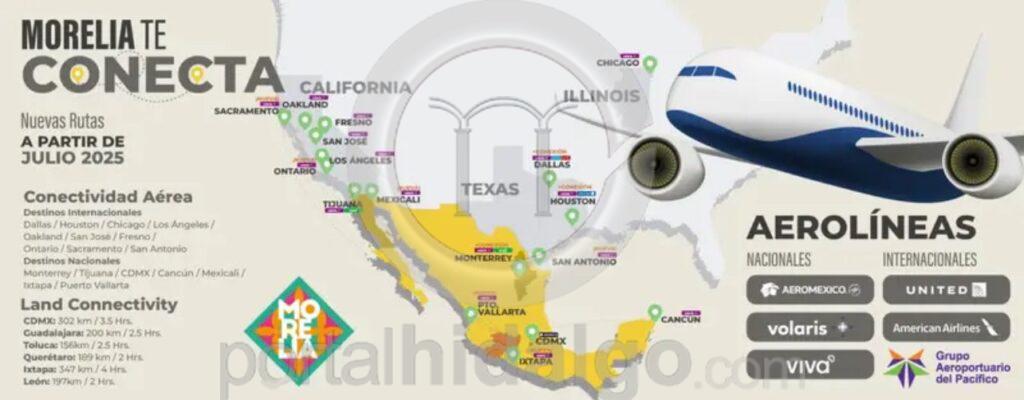 Cabe destacar que Morelia cuenta con una conectividad aérea de siete destinos nacionales y 10 internacionales, con lo que durante los últimos meses, el turismo internacional se ha incrementado en la ciudad por lo que esta nueva conectividad refuerza el acercamiento con el turismo estadounidense, uno de los destinos emisores más importantes para Morelia.