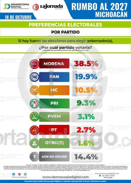 Raúl Morón Orozco será el próximo gobernador de Michoacán, esto de acuerdo a Demoscopia Digital, que de acuerdo a su ejercicio publicado en La Jornada, coloca al actual senador con un 36.1% de las preferencias, que junto al 38.5% de la intención de voto por Morena, hacen ver una victoria contundente en el proceso electoral del 2027.