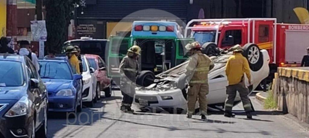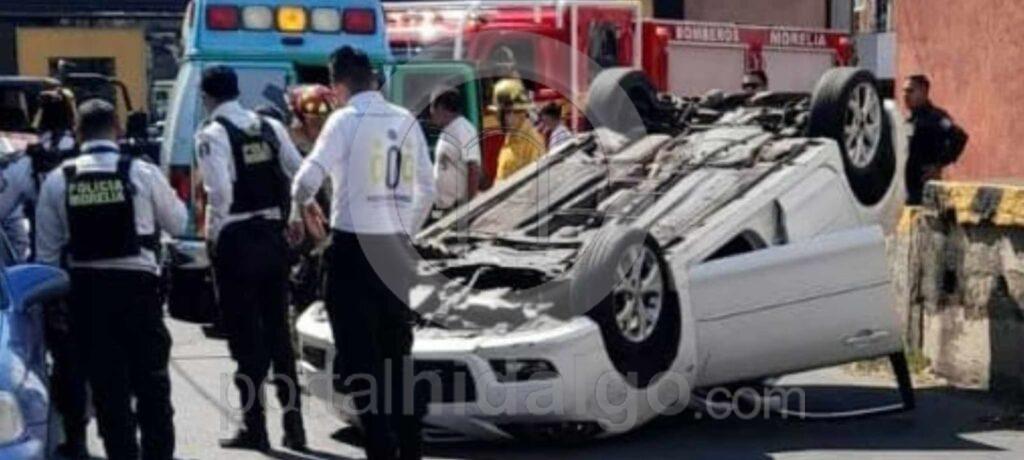 Una mujer embarazada quedó l3sionada tras la volcadura de su vehículo en la colonia Ejidal Ocolusen, ubicada al sur de la ciudad de Morelia.