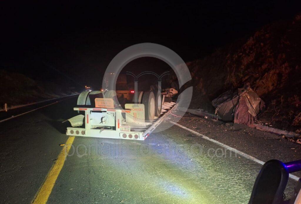 Primeramente, una plataforma se desprendió del tractocamión que la remolcaba y volcó quedando atravesada sobre la vialidad a la altura del kilómetro 193+000, del tramo carretero Nueva Italia – Las Cañas, sin que hubiera personas lesionadas.