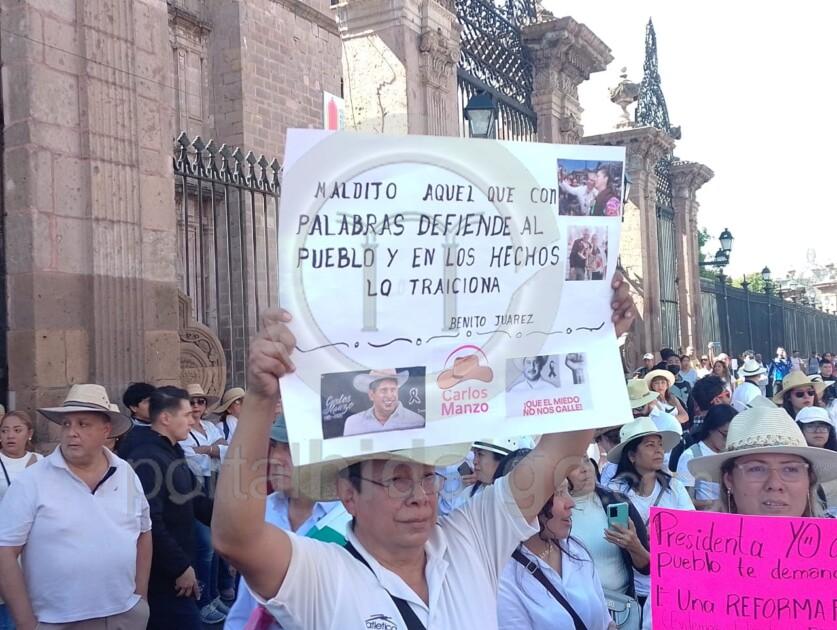 Con arengas contra el gobernador Alfredo Ramírez Bedolla y la presidenta Claudia Sheinbaum Pardo, los manifestantes vestidos de blanco, con rabia e impotencia pidieron fin a la inseguridad y el crimen que ha matado y fracturado familias como la de Carlos Manzo, el alcalde del sombrero quien se atrevió a enfrentar a la delincuencia organizada.