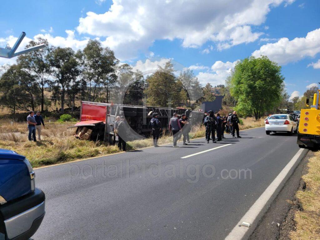 En cuanto al automotor siniestrado, este es un Kenworth, color rojo, con placa 89AX5M y número económico TZ-347, el cual fue retirado por una grúa y llevado junto con el cargamento a un corralón.