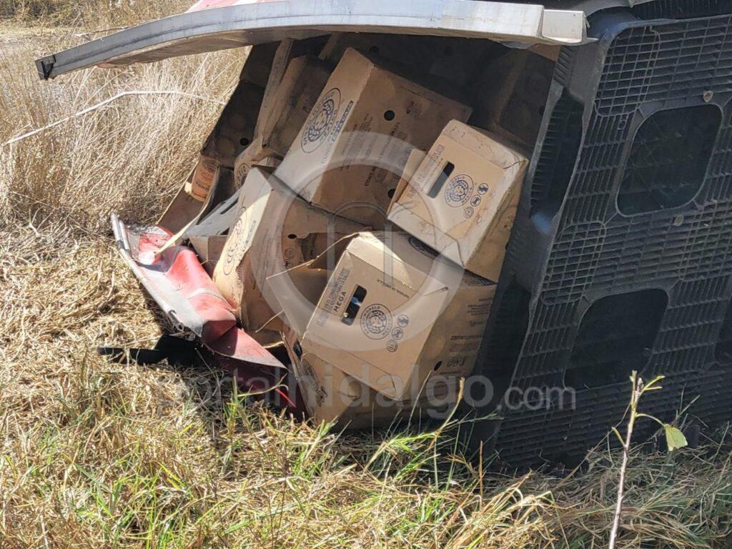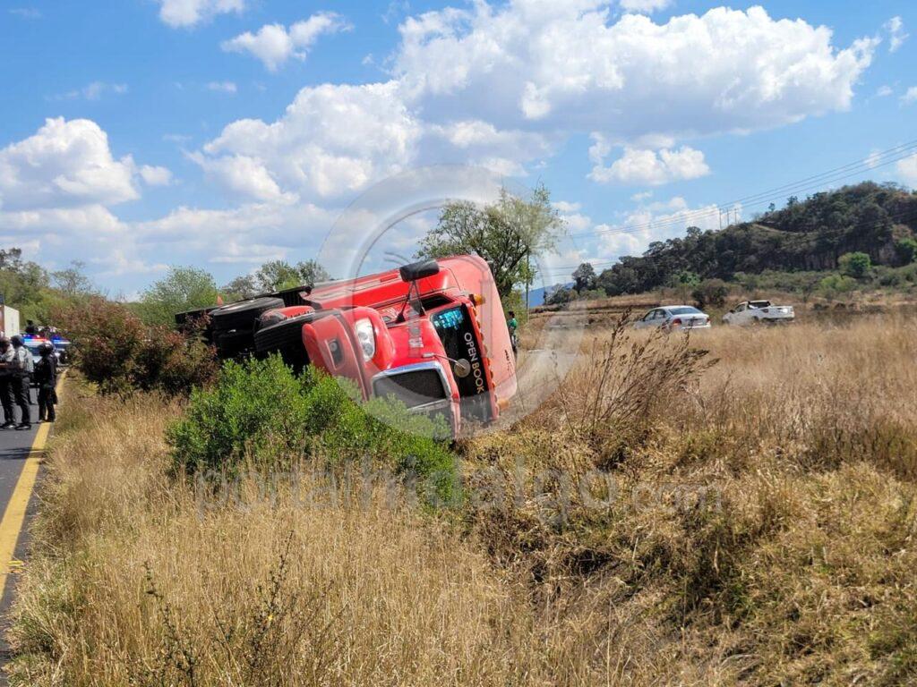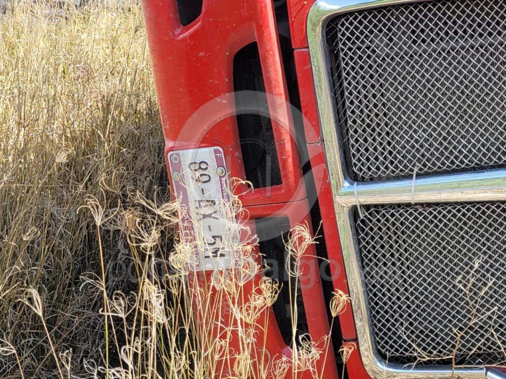 En cuanto al automotor siniestrado, este es un Kenworth, color rojo, con placa 89AX5M y número económico TZ-347, el cual fue retirado por una grúa y llevado junto con el cargamento a un corralón.