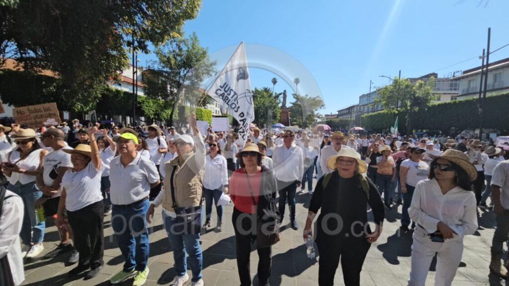 El contingente se reunió en el estacionamiento de la Plaza 500 ubicada en el Libramiento y el Boulevard Industrial, hasta donde llegaron ciudadanos con ropas blancas y pancartas con leyendas como “Justicia para Carlos Manzo”, “Revocación”, y “Justicia, Justicia para todos los caídos”.