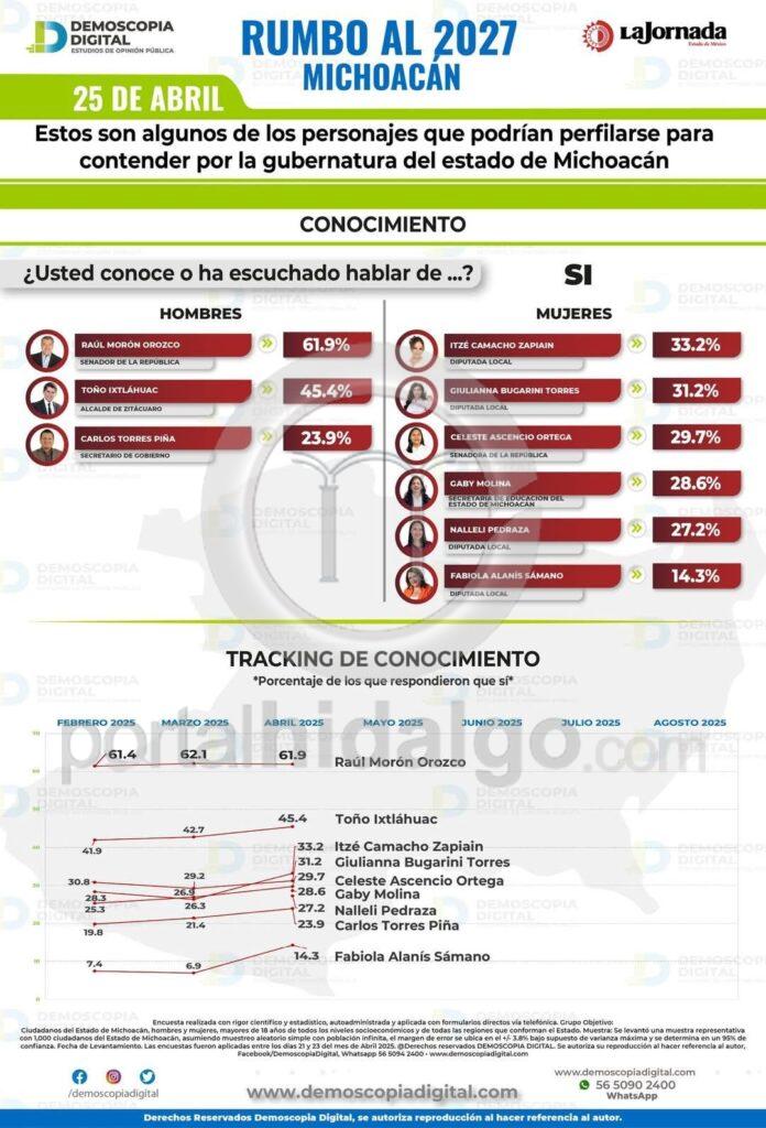 El estudio, correspondiente al mes de abril, revela que Raúl Morón encabeza las menciones con un 24.9% de los encuestados que dijeron preferirlo como candidato del partido guinda. Además, es el político más conocido entre la población michoacana, con un 61.9% de reconocimiento, superando por amplio margen a otros perfiles como Toño Ixtláhuac (45.4%) y Carlos Torres Piña (13.2%).