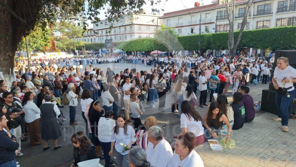 Primeramente, cientos de estudiantes de escuelas católicas se reunieron en la Pérgola Municipal para rezar un rosario y pedir por el descanso eterno de Carlos Manzo, así como por justicia, paz y seguridad para Uruapan, Michoacán y México.