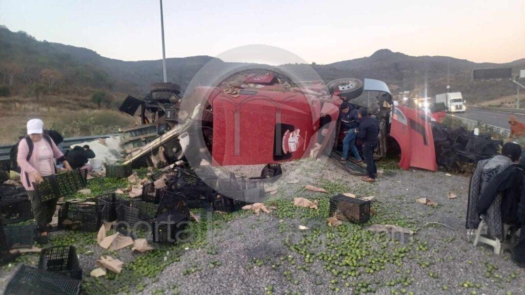 En distintos hechos, un camión cargado con limones volcó en la autopista Pátzcuaro-Cuitzeo, mientras que en la autopista Siglo XXI, un tráiler junto con su plataforma, se precipitaron a un desnivel, con saldo preliminar de dos lesionados y cuantiosos daños materiales.