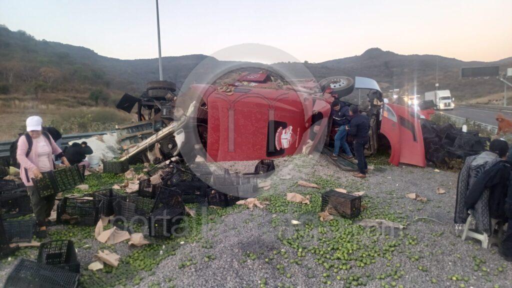 En distintos hechos, un camión cargado con limones volcó en la autopista Pátzcuaro-Cuitzeo, mientras que en la Siglo XXI un tráiler junto con su plataforma se precipitaron a un desnivel, con saldo preliminar de dos lesionados y cuantiosos daños materiales.