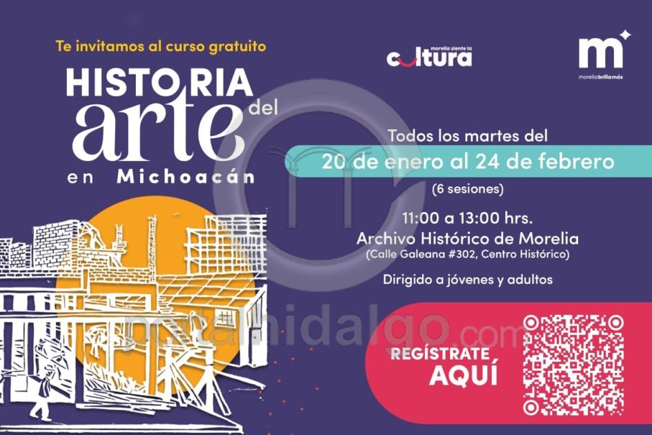 El segundo curso es “Historia del arte en Michoacán”, el cual se realizará todos los martes del 20 de enero al 24 de febrero, siendo un total de seis sesiones, en horario de 11:00 a 13:00 horas, y tendrá como sede el Archivo Histórico de Morelia, ubicado en la calle Galeana #302, en el Centro Histórico. El registro se puede realizar en el siguiente link: https://acortar.link/AGpjuz