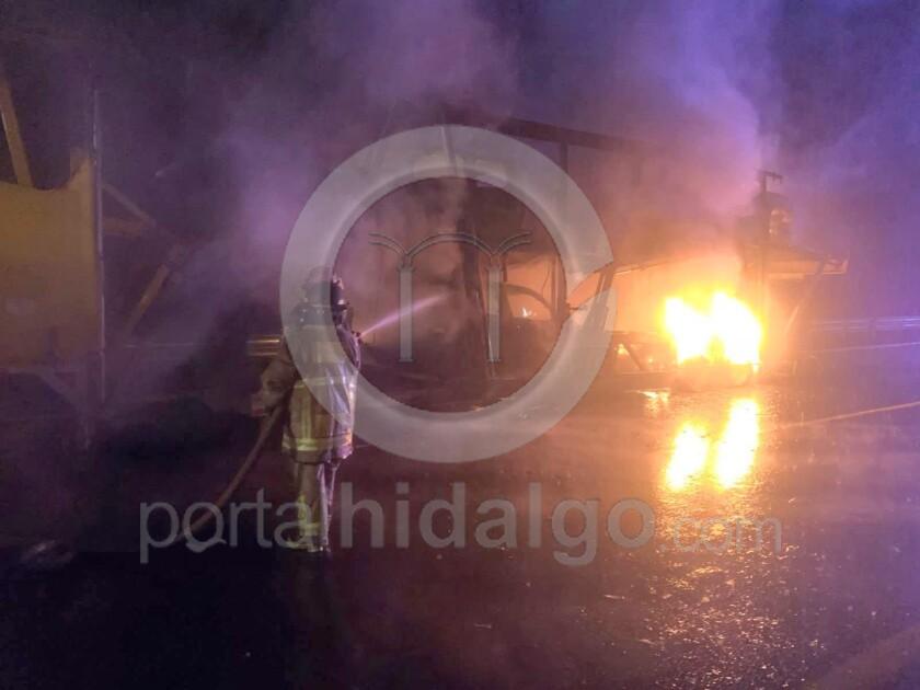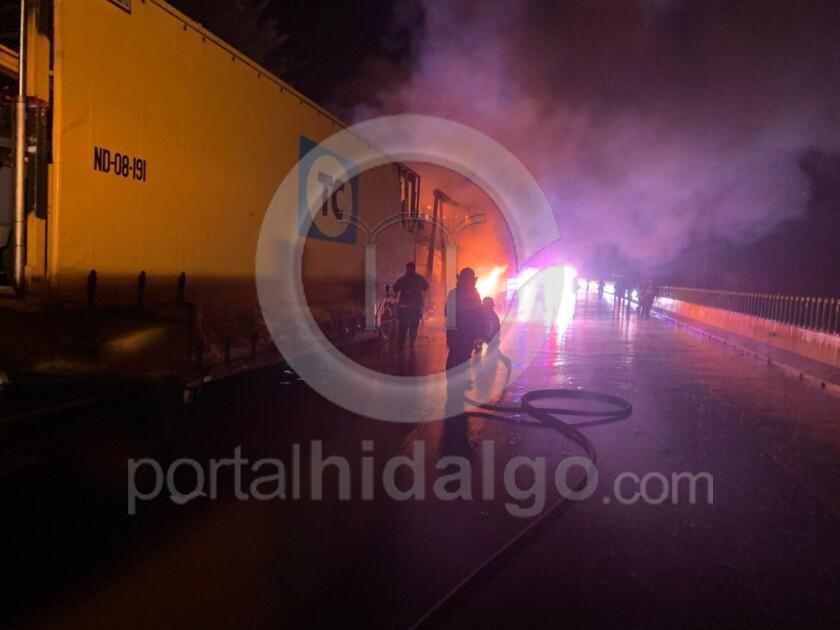 Los “tragahumo” trabajaron por más de 3 horas para controlar el fuego que arrasó por completo uno de los remolques y parcialmente el segundo, de un tráiler marca Kenworth de color amarillo, línea TC, con placas 46-AG-6F del transporte público federal.